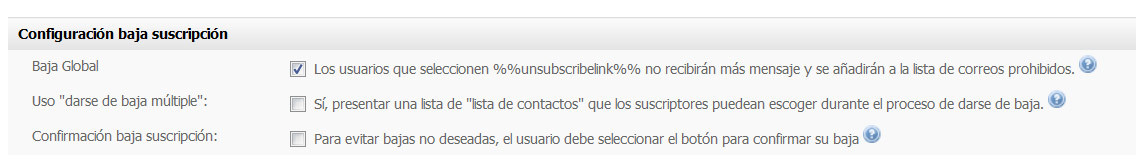 Cuando un usuario se da de baja, puede hacerlo para una única lista o dejar de recibir cualquier comunicado de la plataforma. Si vamos a la opción “Baja Global” podemos activar/desactivar esta funcionalidad